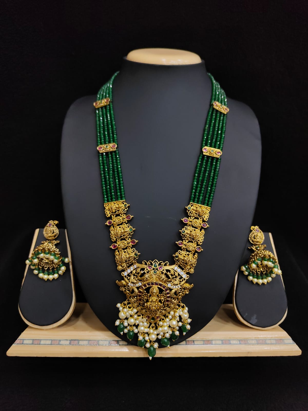 LAKSHMI WITH ELEPHANT DESIGN HARAM WITH PEARL BUNCH HANGING AND MATCHING MANGO DESIGN JUMKA