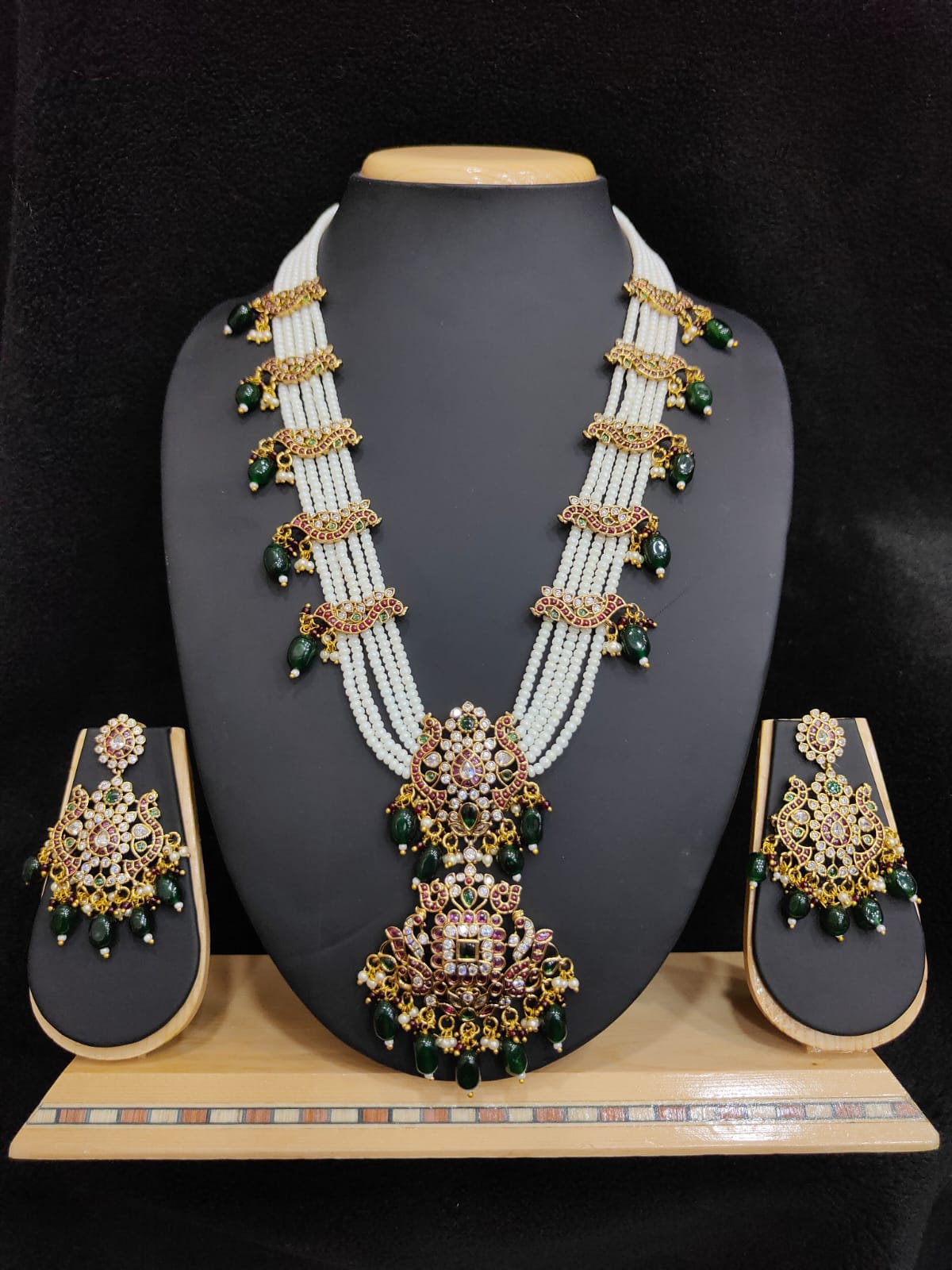 PEACOCK DESIGN PEARL MALASET WITH GREEN BEAD HANGING EARRINGS