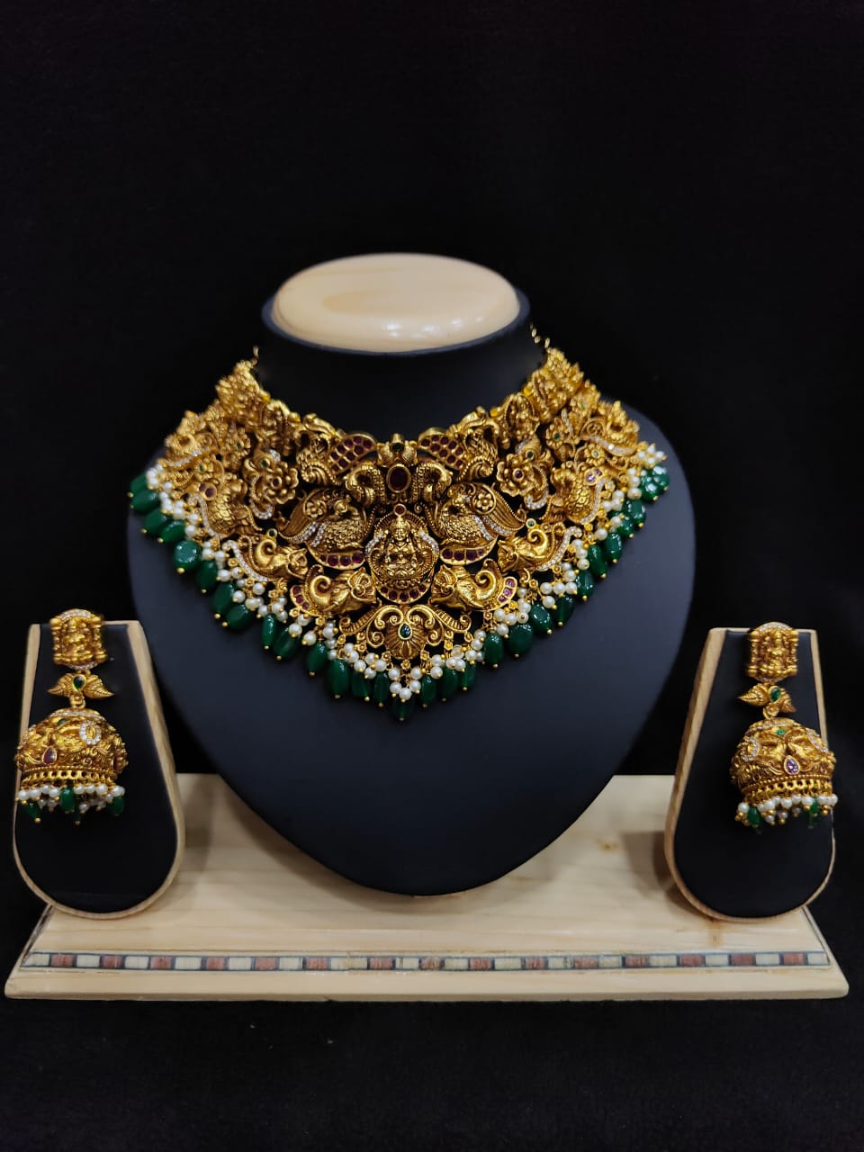 LAKSHMI AND PEACOCK WITH ELEOHANT DESIGN ANTIQUE CHOKKER WITH LONG JUMKA