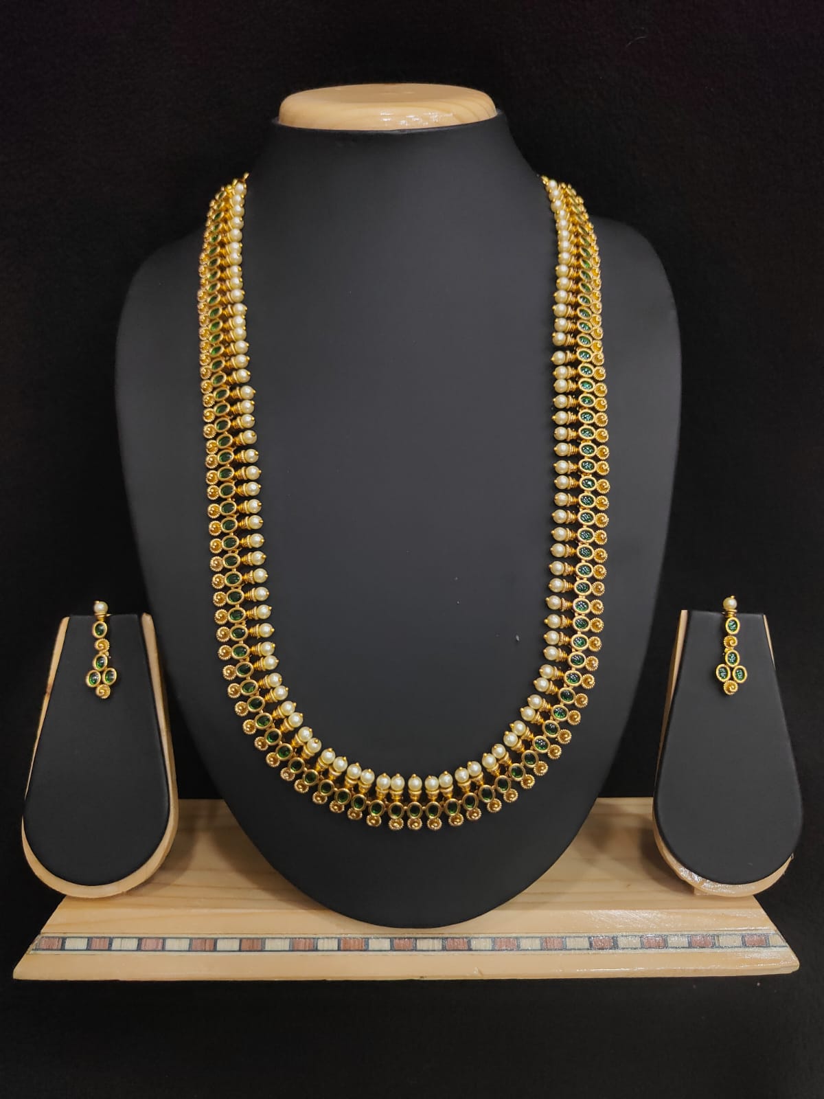 OVAL SHAPE GREEN KEMP STONE ANTIQUE POLISH HARAM WITH EARRINGS