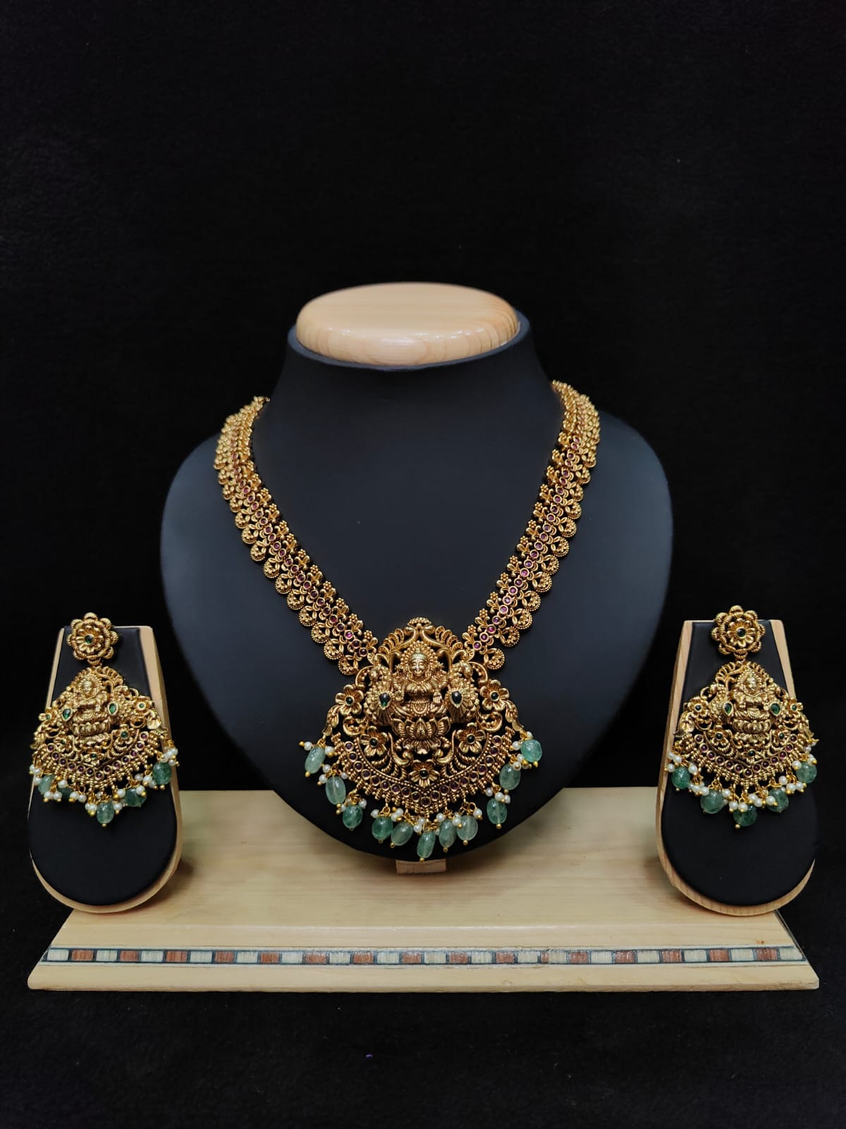FLORAL WITH LAKSHMI DESIGN GREEN BEADS HANGED ANTIQUE NECKLACE WITH EARRINGS