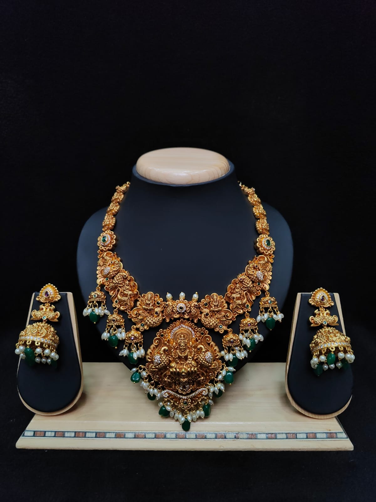 LAKSHMI WITH PEACOCK DESIGN ANTIQUE NECKLACE WITH JUMKA