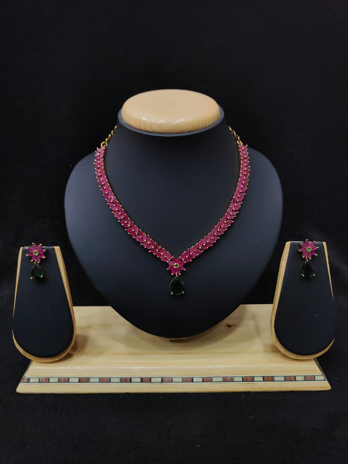 LEAF DESIGN RUBY AND GREEN STONE ANTIQUE NECKLACE WITH EARRINGS