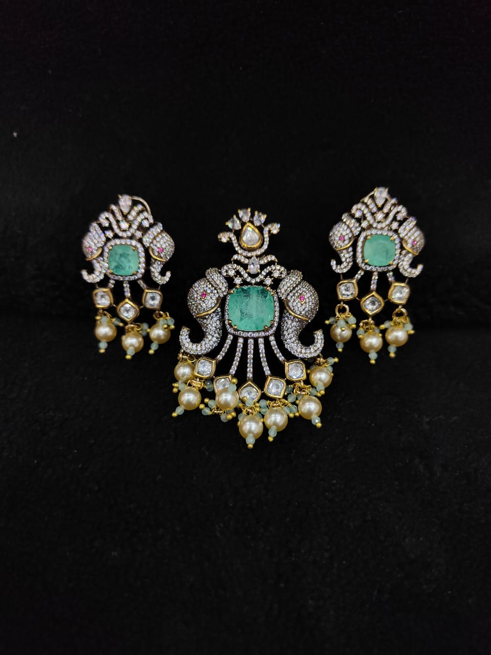 VICTORIAN POLISH ELEPHANT DESIGN AD ZIRCON STONE PENDANT WITH EARRINGS
