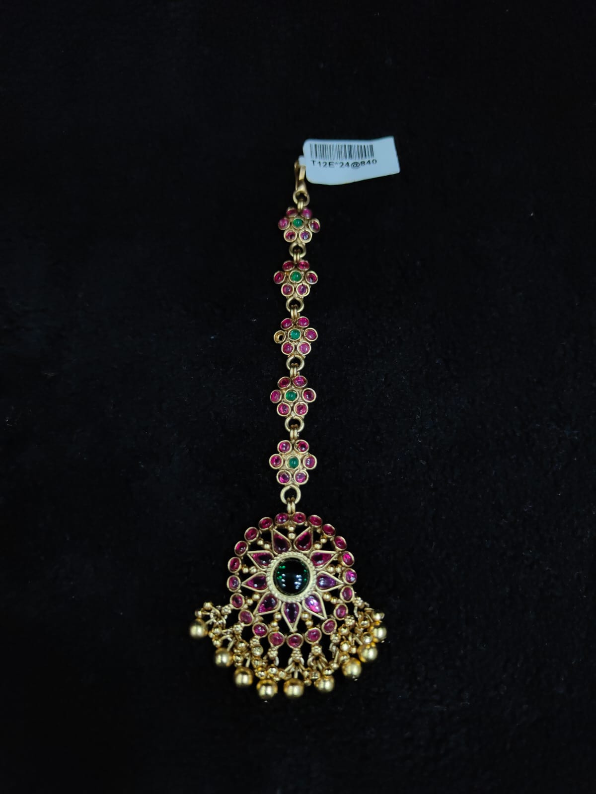 FLORAL DESIGN KEMP STONE ANTIQUE TIKKA WITH GOLD BALL HANGING